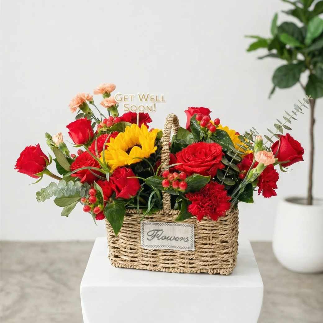 รหัส BASKR01 ถูกออกแบบมาเพื่อส่งต่อพลังใจโดยเฉพาะ ด้วยการผสมกุหลาบแดง เยียเบีร่าแดง และทานตะวันสดใสในตะกร้าหวายใบเล็กกะทัดรัด มาพร้อมป้าย “Get Well Soon” ที่ช่วยทำหน้าที่บอกความห่วงใยแทนคุณได้อย่างดีเยี่ยม
