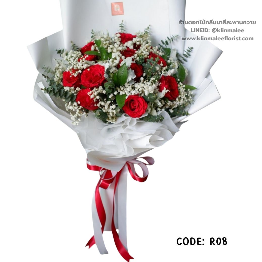 จำนวน กุหลาบแดง 12 ดอก ช่อขาวพรีเมียม แซมยิปโซและยูคาลิปตัส ชิ้น