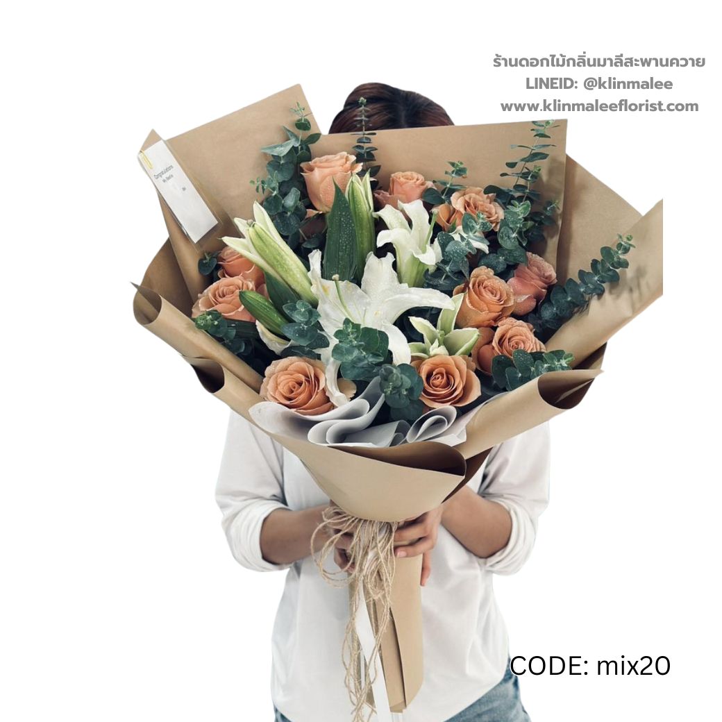 จำนวน กุหลาบพีช ลิลลี่ขาว ยูคาลิปตัส จัดฟูแน่นทรงสูง ห่อกระดาษคราฟท์น้ำตาลโทนอุ่น ชิ้น
