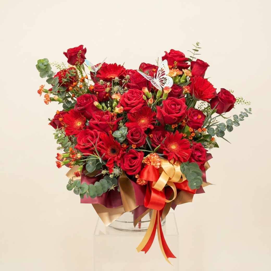 รหัส BOXRO04 คือการผสมผสานสีสันที่แสดงถึงความมั่งคั่งและความรัก ด้วยกุหลาบแดงและเยียเบีร่าแดงจัดวางในกล่องใสที่เผยให้เห็นความงามรอบด้าน ตกแต่งด้วยโบว์สีทองและแดงซ้อนกัน ให้ความรู้สึกที่ดูหรูหราอู้ฟู่และเป็นมงคลอย่างยิ่ง