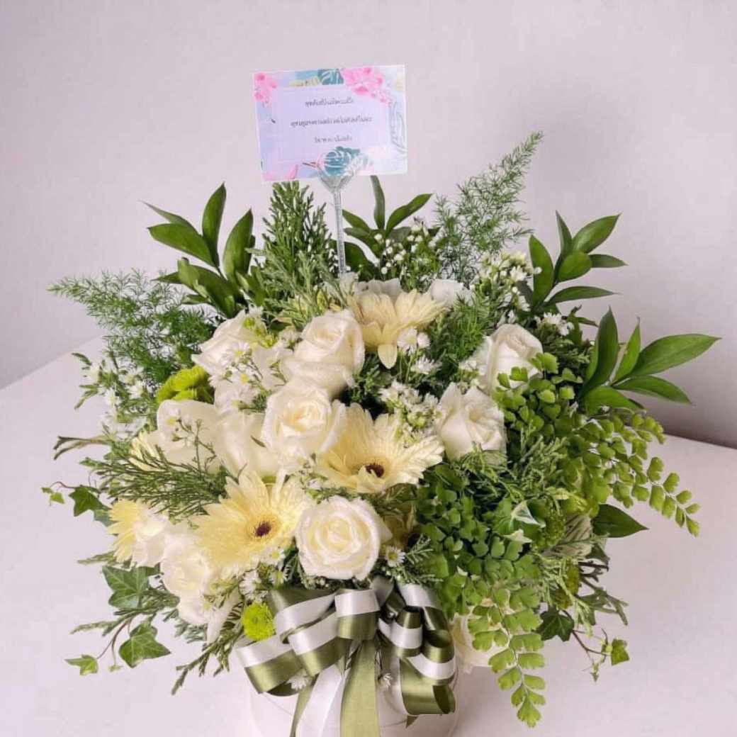 Note: “เพื่อให้คุณลูกค้าได้รับสิ่งที่ดีที่สุด ชนิดของดอกไม้และอุปกรณ์บางรายการอาจมีการปรับเปลี่ยนตามฤดูกาลหรือสินค้าที่มีในคลัง ทางร้านขออนุญาตเลือกสรรสิ่งทดแทนที่มีมูลค่าเท่ากันหรือสูงกว่า โดยยังคงคุมโทนความสวยงามตามแบบไว้เป็นหลัก”