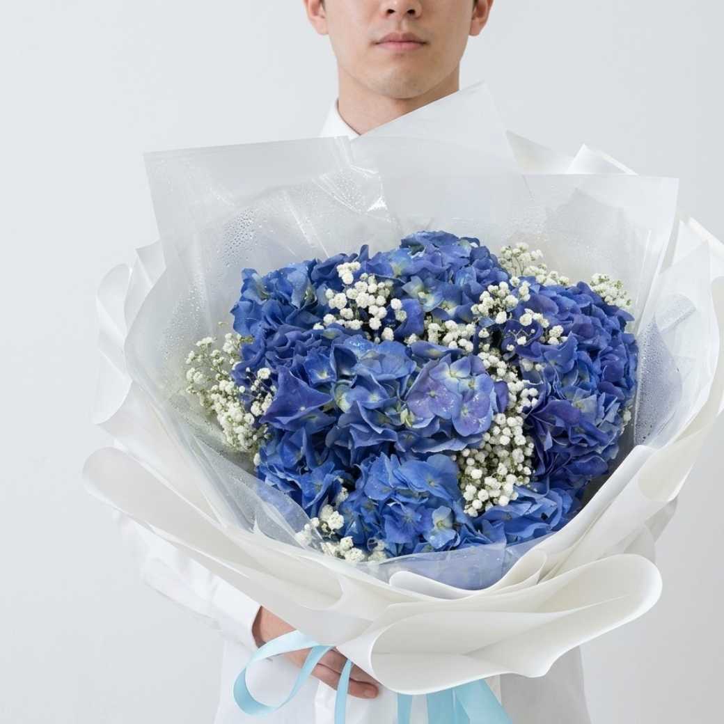 HY03 – ช่อไฮเดรนเยียสีน้ำเงินเข้มแซมดอกยิปโซขาว สะอาดตาใน โทนสีขาว จัดพุ่มใหญ่สไตล์เกาหลี ยอดนิยมสำหรับ วันรับปริญญา สั่งดอกไม้ ส่งฟรีเขตจตุจักร พญาไท และพื้นที่ใกล้เคียงได้ง่ายๆ ครับ