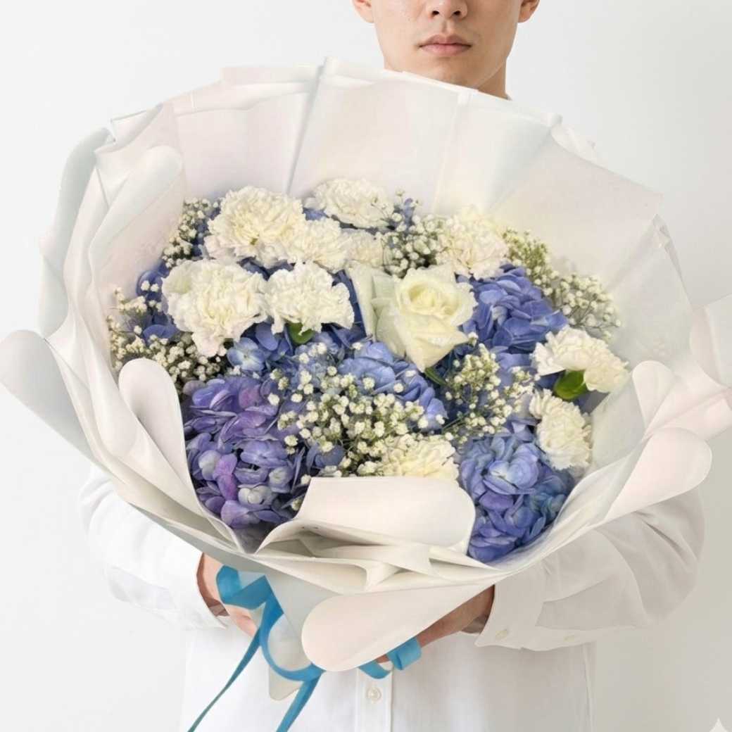 HY05 – ช่อดอกไม้ไฮเดรนเยียผสมสีฟ้า-ขาว จัดทรงกลมแบบ สไตล์โมเดิร์น เน้นความละมุนด้วยกระดาษห่อสีขาวเลเยอร์สวยงาม เหมาะเป็นของขวัญ วันเกิด สั่ง ช่อดอกไม้ราคาถูก แต่คุณภาพพรีเมียมได้ที่ Klinmalee Florist ครับ