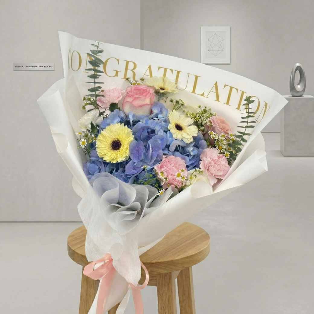 รหัส MB05 รวบรวมความหวานของดอกไม้หลากสีสัน ทั้งกุหลาบสีชมพู เยียเบีร่าสีเหลือง และไฮเดรนเยียสีฟ้า จัดวางอย่างประณีตภายใต้หัวข้อการเฉลิมฉลอง เป็นช่อที่รวมความสดใสทุกเฉดสีไว้ในหนึ่งเดียวอย่างลงตัว