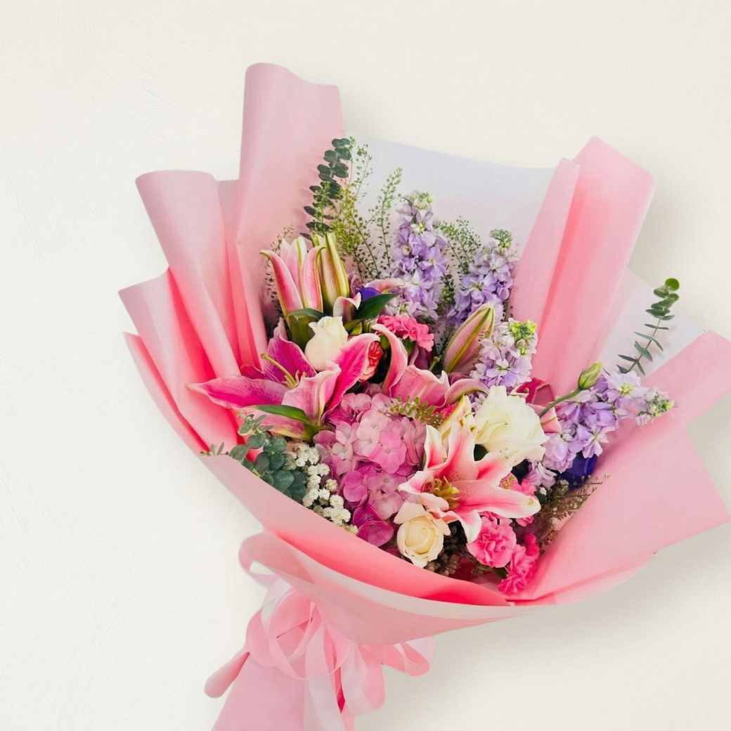 ฉีกกฎความหวานแบบเดิมๆ ด้วยรหัส MP01 ที่เน้นโทนสีชมพูบานเย็น (Hot Pink) และสีม่วงแดงสด จัดแต่งร่วมกับดอกลิลลี่และใบยูคาลิปตัส ห่อด้วยกระดาษสีชมพูสดใสสลับชั้นอย่างมีสไตล์ เป็นช่อที่ให้ความรู้สึกขี้เล่นและเต็มไปด้วยชีวิตชีวา
