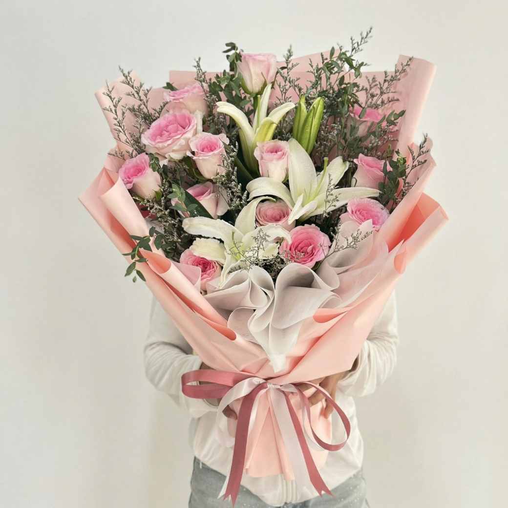 MP06-ช่อลิลลี่ขาว-กุหลาบชมพู-โทนหวาน-ห่อชมพู-ช่อสูงสง่า