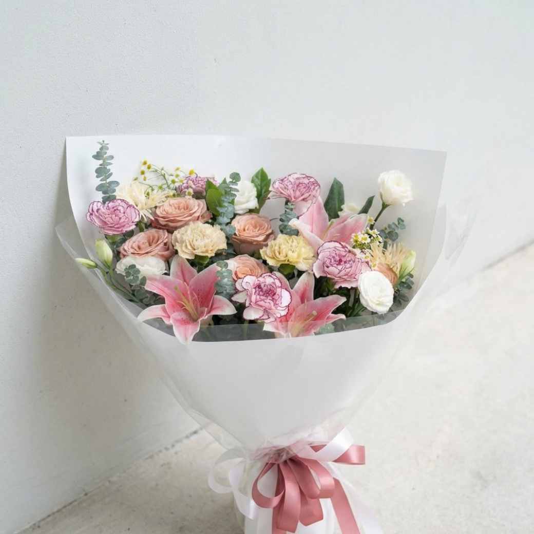 รหัส MP07 เป็นการจัดดอกไม้ในสไตล์ยุโรปที่รวมดอกกุหลาบสีพีช ดอกคาร์เนชั่น และดอกลิลลี่เข้าด้วยกันในโทนสีพาสเทลที่ดูวินเทจ การจัดวางเน้นความแน่นและกลมมน ห่อด้วยกระดาษสีขาวพรีเมียมที่ดูเรียบหรู