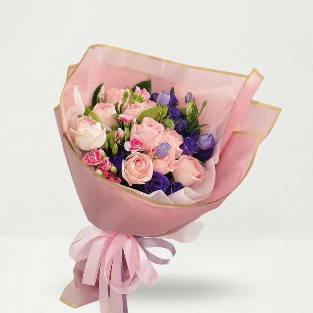 รหัส MP10 นำเสนอดอกไม้โทนสีชมพูอมม่วงที่ดูน่าค้นหา ประกอบด้วยกุหลาบสีชมพูหวานและดอกสแตติสสีม่วงเข้ม ห่อด้วยกระดาษสีชมพูกลีบบัวที่มีขอบสีทองบางๆ ช่วยเพิ่มความหรูหราแบบโมเดิร์นคลาสสิก