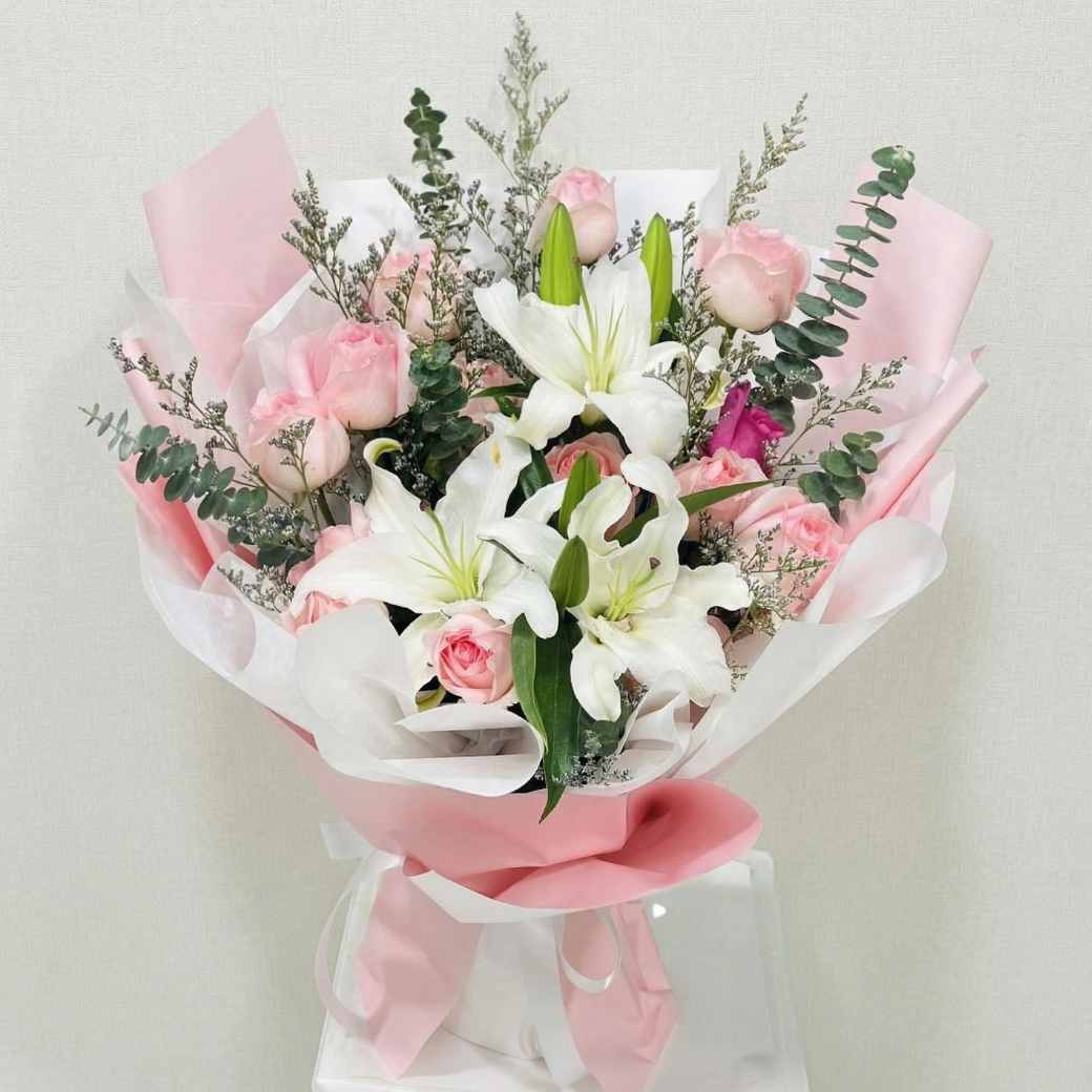ช่อดอกไม้สด MP11 ความละมุนของ ช่อดอกกุหลาบขาว แซมด้วยลิลลี่และกุหลาบชมพู จัดส่งรวดเร็วทันใจจาก ร้านดอกไม้ห้วยขวาง และพื้นที่ใกล้เคียง ส่งดอกไม้ กทม ราคาถูก ต้องรหัสนี้
