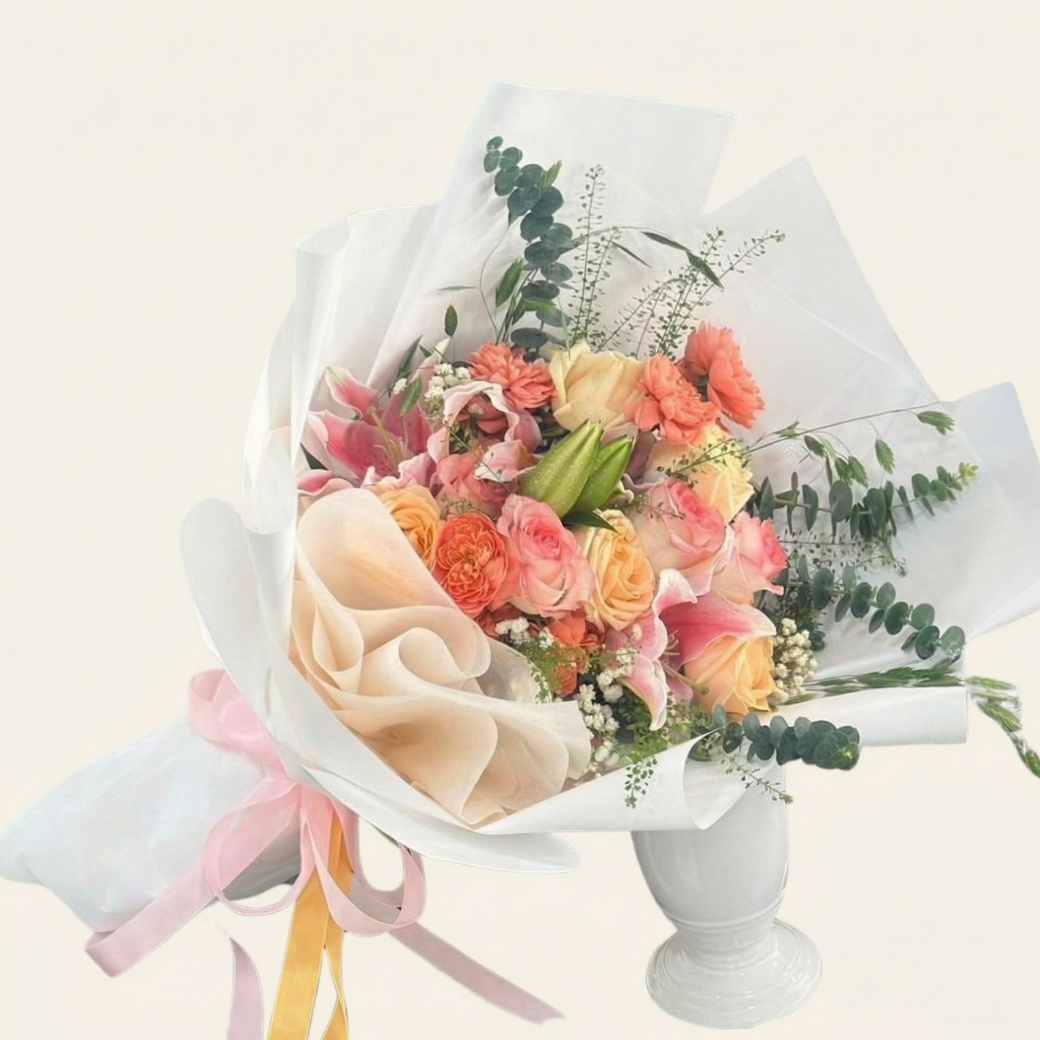 ช่อดอกไม้สด MPTO3 ช่อดอกไม้สีสดใสที่รวม ช่อดอกลิลลี่ และกุหลาบโทนส้มพีช เข้ากับใบยูคาลิปตัสที่ให้กลิ่นอาย โทนธรรมชาติ เหมาะสำหรับเป็น สั่งดอกไม้ delivery ใกล้ฉัน เพื่อเซอร์ไพรส์คนพิเศษ