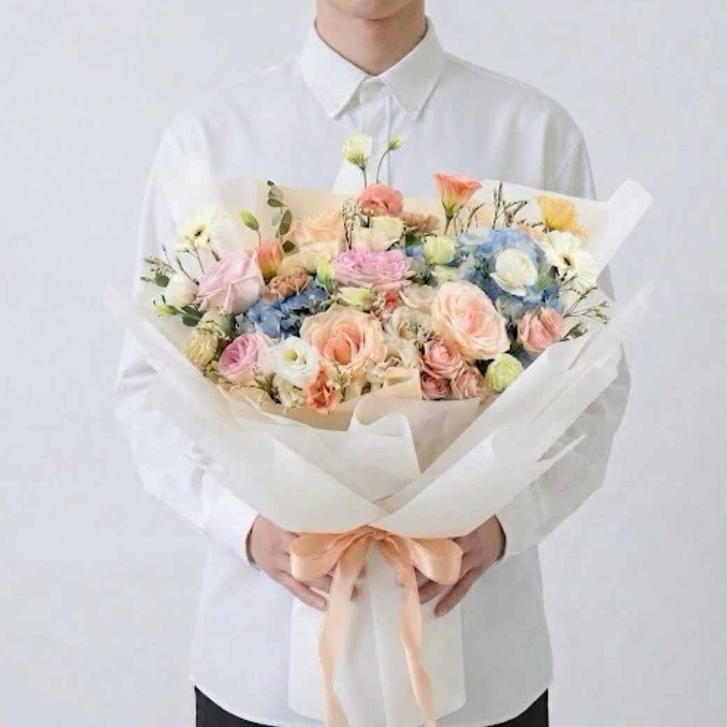 โทนสีพาสเทลสื่อถึงความรักที่บริสุทธิ์ มิตรภาพที่ยืนยาว และความปรารถนาดีที่สุภาพ การเลือกใช้ดอกไม้หลายชนิดมาจัดรวมกันในช่อเดียว (Mix Flowers) เปรียบเสมือนการรวบรวมความสุขและความสดใสส่งตรงถึงมือผู้รับ