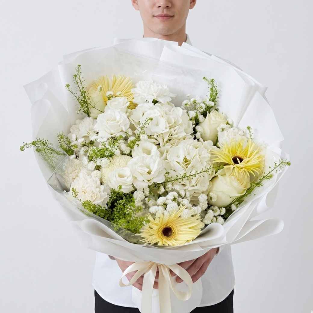 ดอกเยียเบีร่าสีขาวสื่อถึงความไร้เดียงสาและความสุขที่เรียบง่าย เมื่อนำมาจัดรวมกันในช่อขนาดใหญ่เช่นนี้ จึงสื่อถึงความปรารถนาดีที่ท่วมท้น โทนสีขาวสว่างนี้ช่วยขับผิวของผู้ถือให้ดูโดดเด่นมากยิ่งขึ้นในภาพถ่าย