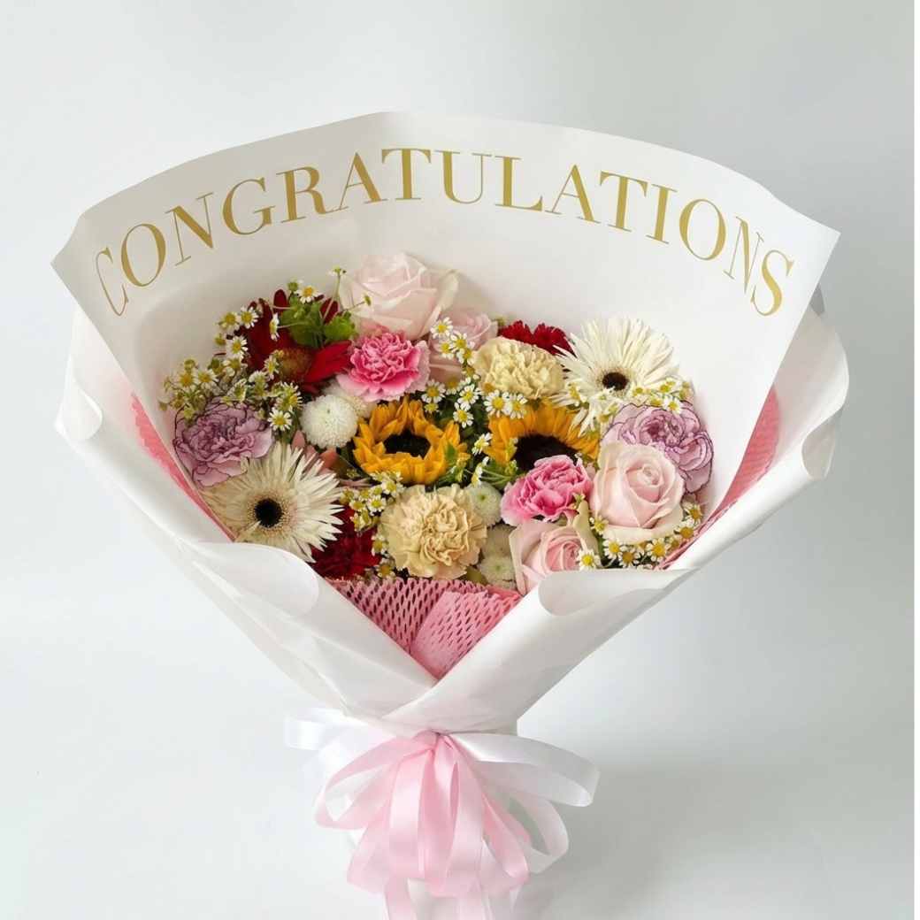 รหัส MY04 นำเสนอความยินดีผ่านโทนสีพาสเทลสุดหวาน (Pastel Tone) โดยมีดอกทานตะวันขนาดพอเหมาะเป็นจุดเด่น ล้อมรอบด้วยดอกกุหลาบสีชมพูและดอกไม้โทนสีอ่อน ห่อด้วยกระดาษสีขาวและมีข้อความ “CONGRATULATIONS” สีทองหรูหรา