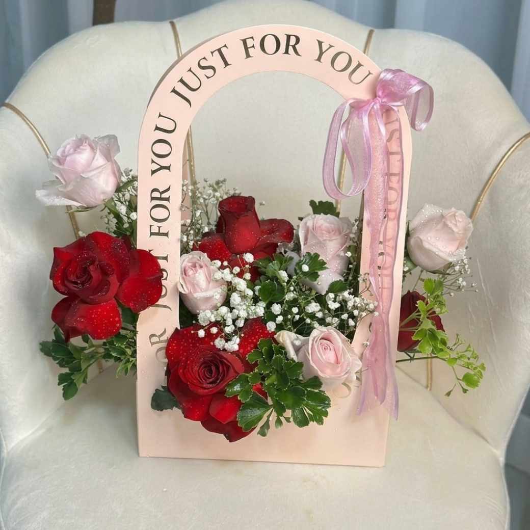 รหัส PHP02 เปลี่ยนความคลาสสิกของกุหลาบแดงให้ดูโมเดิร์นขึ้นด้วยการจัดในถุงกระดาษหูหิ้วสีชมพูอ่อน ประดับด้วยยิปโซสีขาวกระจ่างตา เป็นการจับคู่สีแดงและชมพูที่ดูหวานฉ่ำและโรแมนติกแบบมีสไตล์