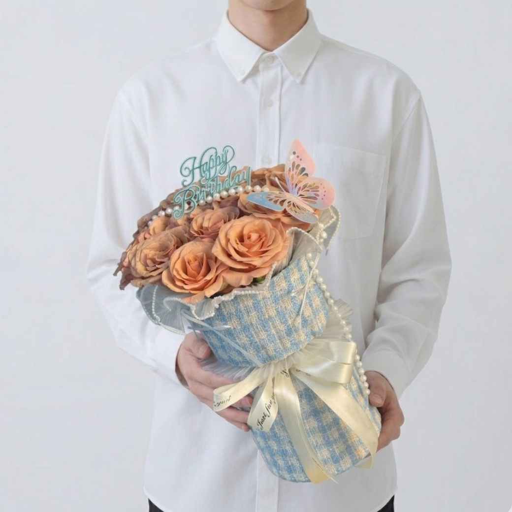รหัส RE03 ยกระดับงานดีไซน์ด้วยการนำกุหลาบสีส้มอิฐสดใสมาจัดวางในห่อกระดาษลาย Tweed สีฟ้าขาวสุดหรู ประดับด้วยโบว์สีขาวพริ้วไหวและกิมมิคผีเสื้อน่ารัก เป็นช่อที่ผสมผสานโลกของแฟชั่นและความงามจากธรรมชาติเข้าด้วยกันได้อย่างลงตัวที่สุด