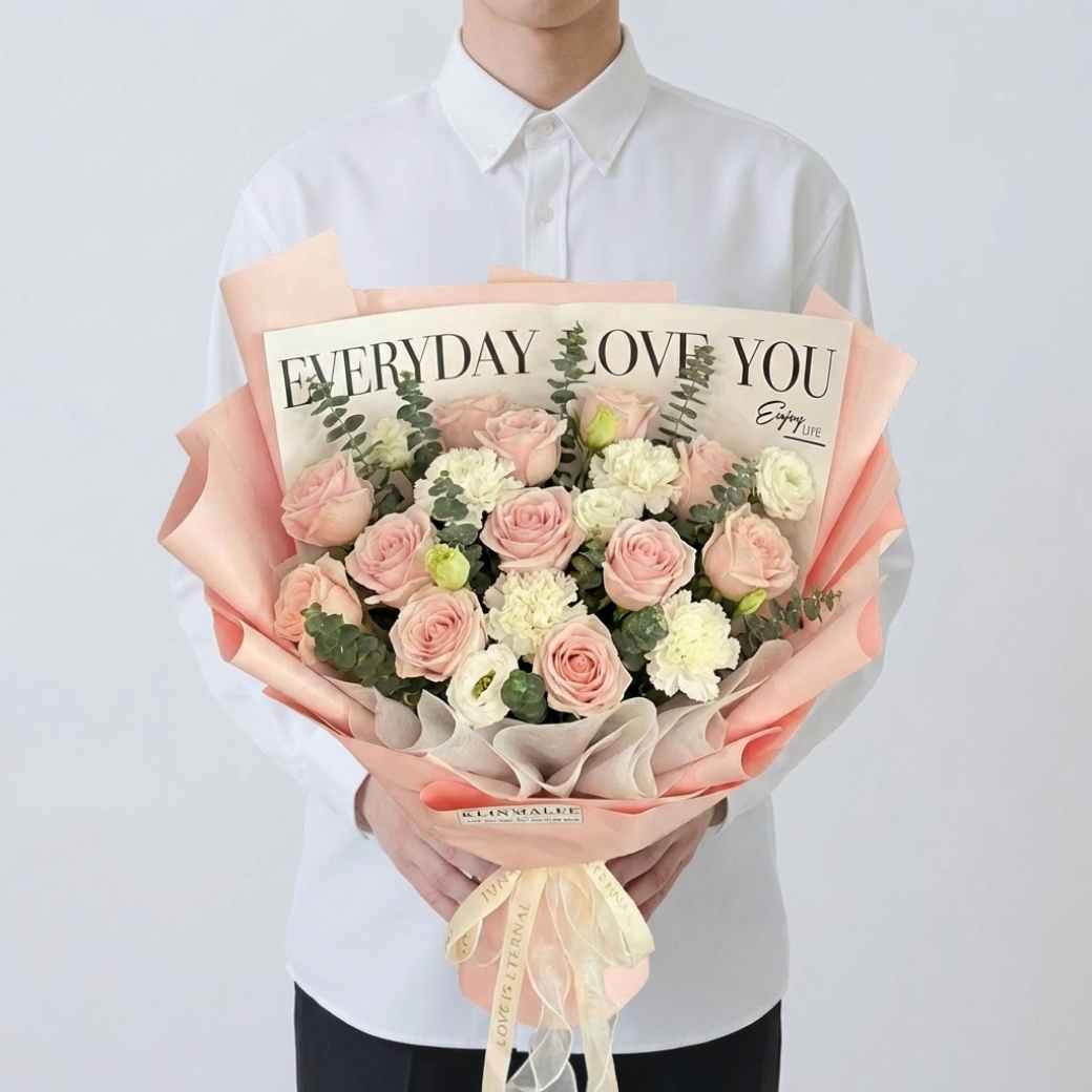 รหัส RM06 นำเสนอความสดใสผ่านดอกกุหลาบสีส้มพีชและสีขาว แซมด้วยใบยูคาลิปตัสที่ให้ลุคธรรมชาติ ห่อด้วยกระดาษสีส้มอ่อนและพิมพ์ลายตัวอักษรเก๋ๆ ให้ความรู้สึกที่ดูอบอุ่น มั่นใจ และเต็มไปด้วยความหวัง