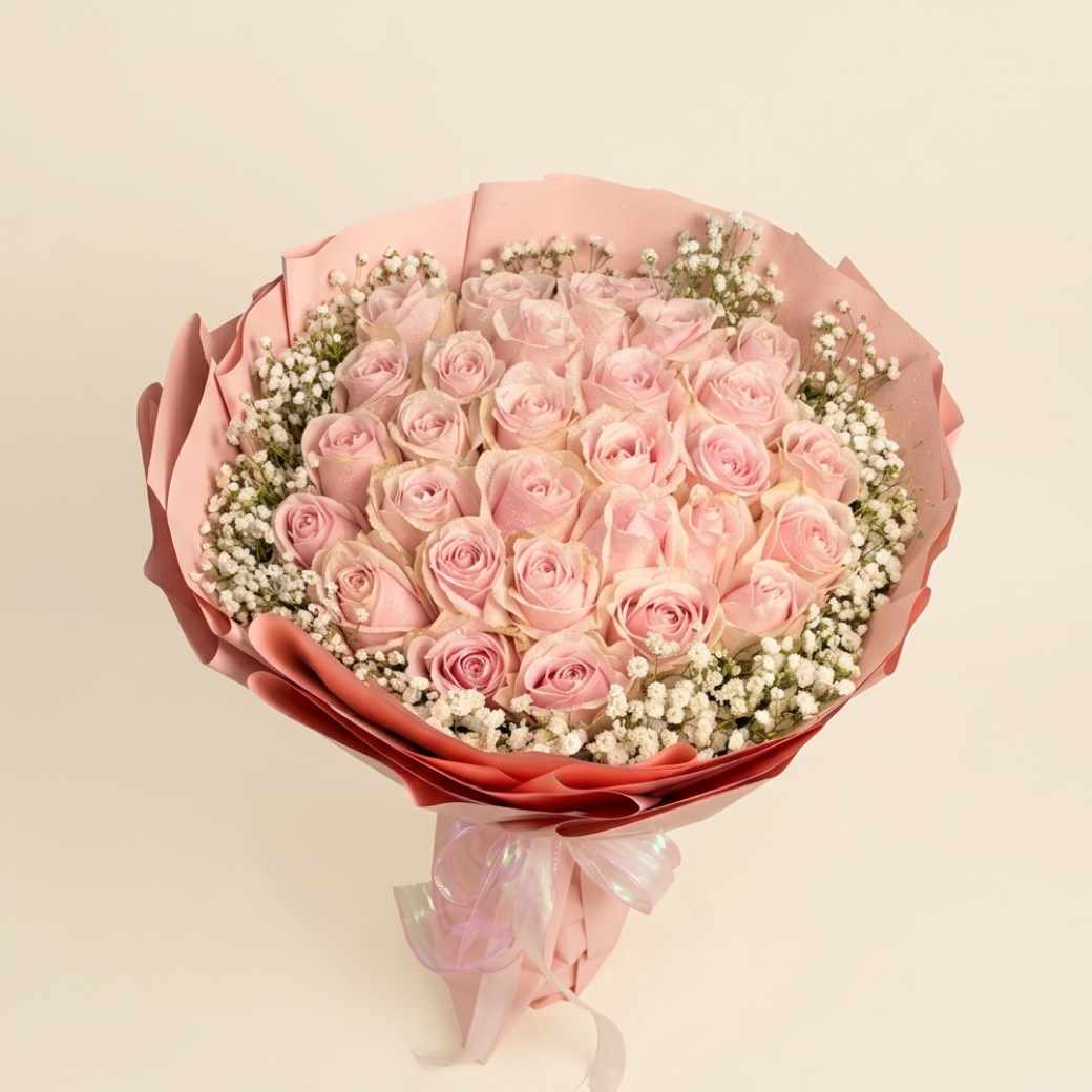 ช่อดอกไม้สด RP17 ช่อกุหลาบสีชมพูหวานจัดแน่นแซมด้วยยิปโซขาวรอบช่อ มอบความรู้สึกสดชื่นใน โทนธรรมชาติ สั่งดอกไม้ใกล้ฉัน ได้ทันใจ พร้อมบริการส่งด่วนทั่วกรุงเทพฯ