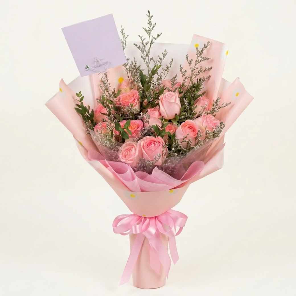 ปิดท้ายด้วยรหัส RP18 ช่อกุหลาบสีชมพูที่จัดวางร่วมกับดอกสแตติสและใบไม้ประดับทรงสูง ให้ลุคที่ดูเป็นธรรมชาติ (Organic Look) เหมือนเพิ่งเก็บดอกไม้มาจากทุ่งหญ้ายามเช้า ห่อด้วยกระดาษสีชมพูพาสเทลพิมพ์ลายเก๋ไก๋ เป็นช่อที่มีชีวิตชีวาและเท่ไม่เหมือนใคร