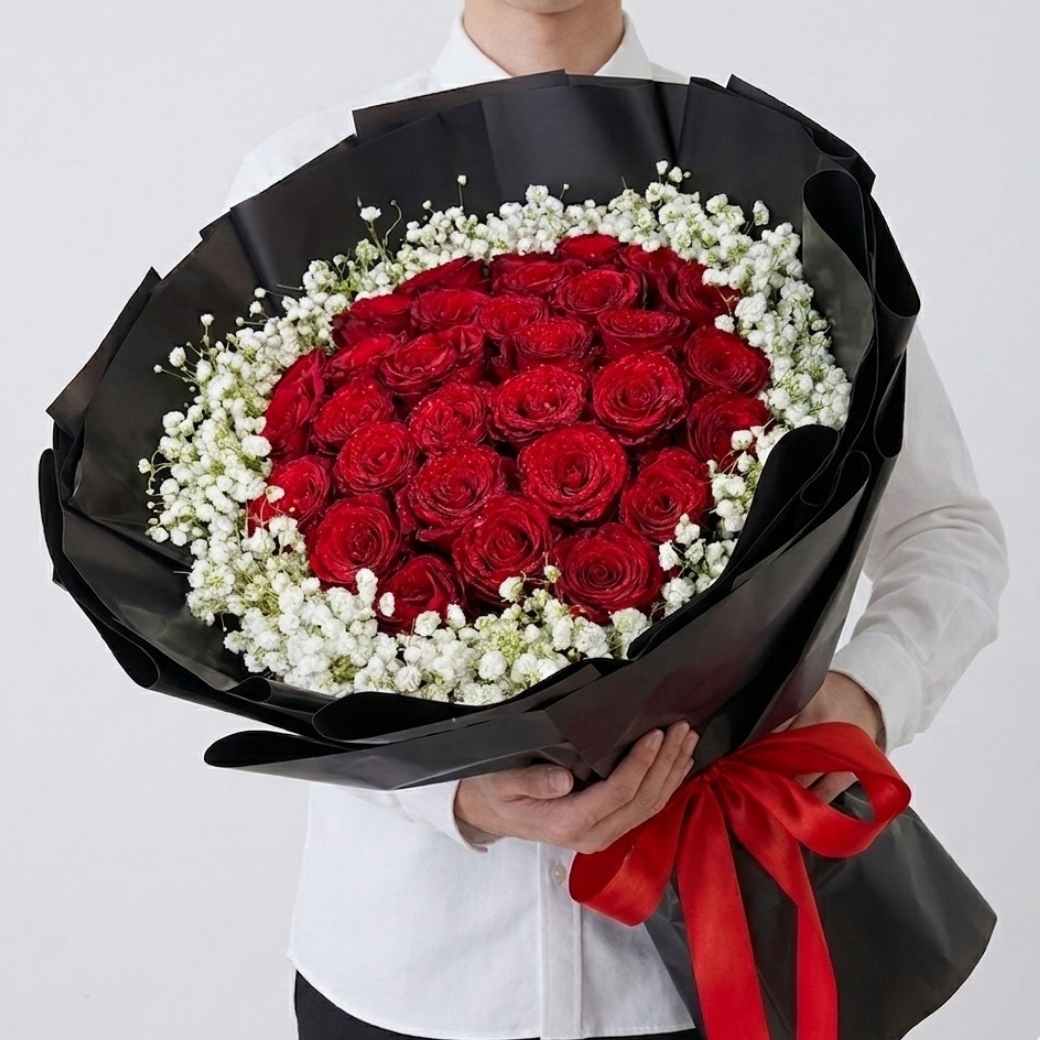 ช่อดอกไม้สด RR16 สวยเฉี่ยวทันสมัยด้วยการจัด โทนดำ ตัดกับกุหลาบแดงและยิปโซขาวรอบช่อ เหมาะสำหรับเป็น ช่อดอกไม้ราคาถูก ที่ดูหรูหราเกินราคา มอบให้แฟนในวัน วันครบรอบ รับรองประทับใจแน่นอน