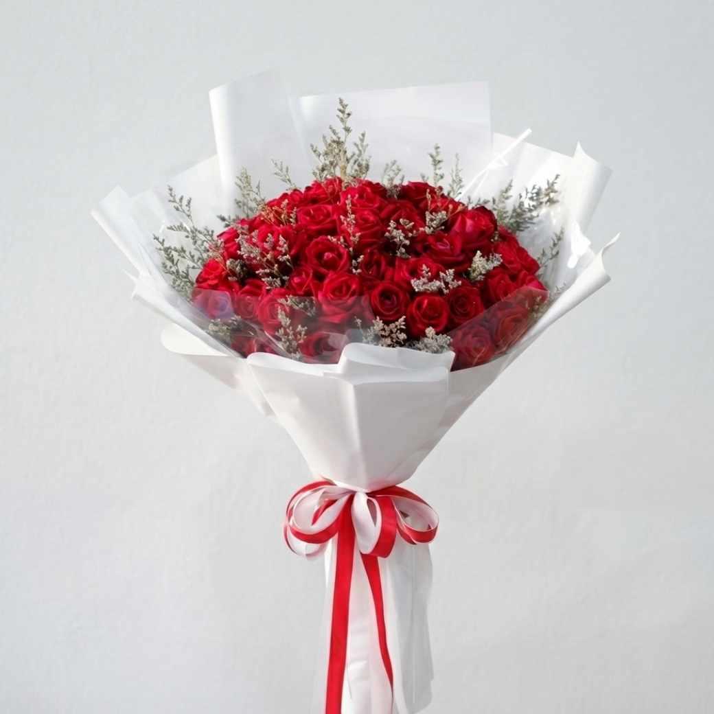 รหัส RR28 นำเสนอความยิ่งใหญ่ด้วยพุ่มกุหลาบแดงขนาดใหญ่พิเศษ จัดแต่งร่วมกับดอกสแตติสและใบไม้ประดับทรงสวย ห่อด้วยกระดาษสีขาวขุ่นเลเยอร์ฟูพริ้วไหว ผูกริบบิ้นสีขาวและแดงซ้อนกัน สื่อถึงความยินดีอย่างหาที่สุดมิได้และความรักที่ท่วมท้นใจ