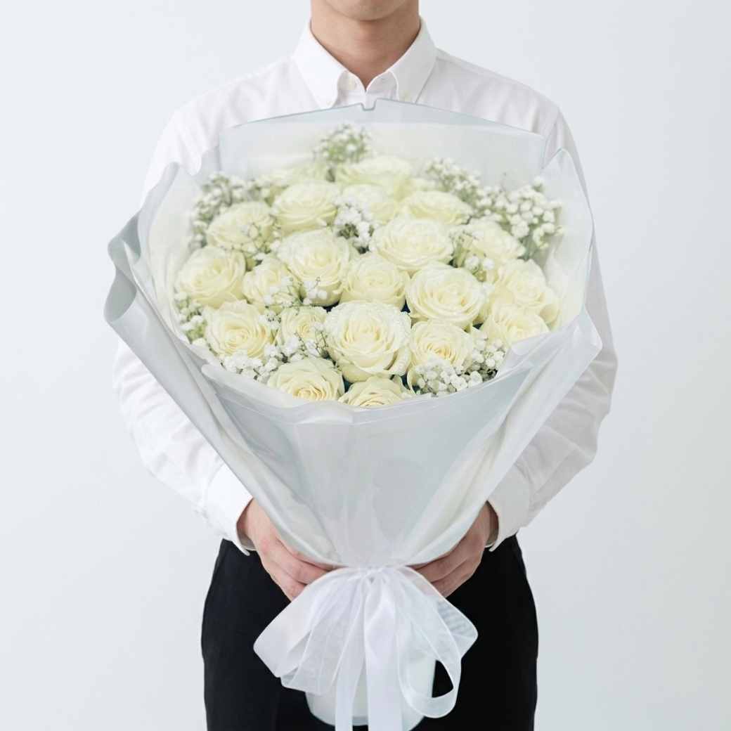 การมอบช่อดอกไม้ขนาดใหญ่สื่อถึงความรักและการให้ความสำคัญอย่างสูงสุด กุหลาบขาวจำนวนมากในช่อนี้เปรียบเสมือนคำอวยพรที่บริสุทธิ์ใจที่สุด เป็นงานดีไซน์ตาม สไตล์การจัดดอกไม้ยุโรป ที่เน้นความพองฟูและดูมีมิติ