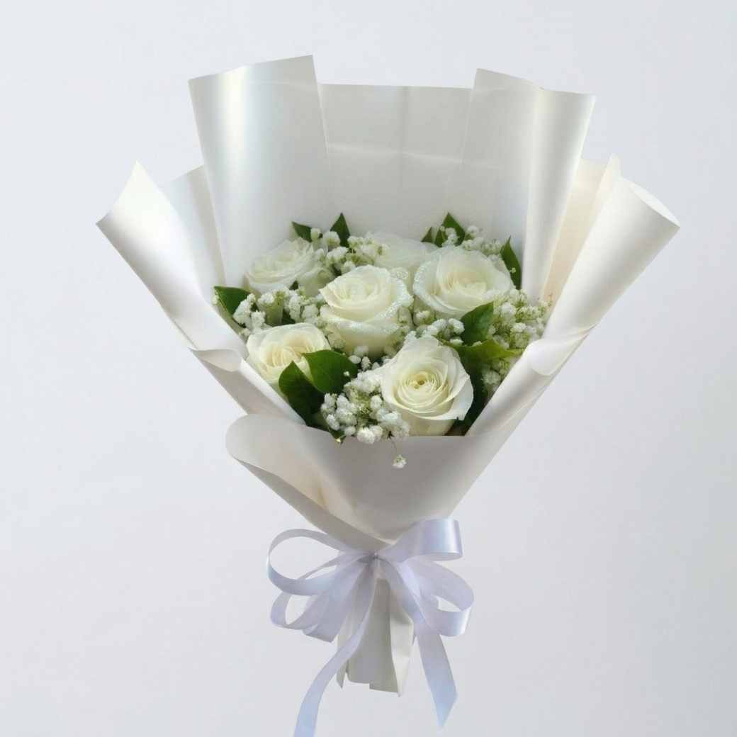 RW15-ช่อกุหลาบขาวทรงสูง สง่างาม พร้อมริบบิ้นผ้าซาตินสีขาวพรีเมียม