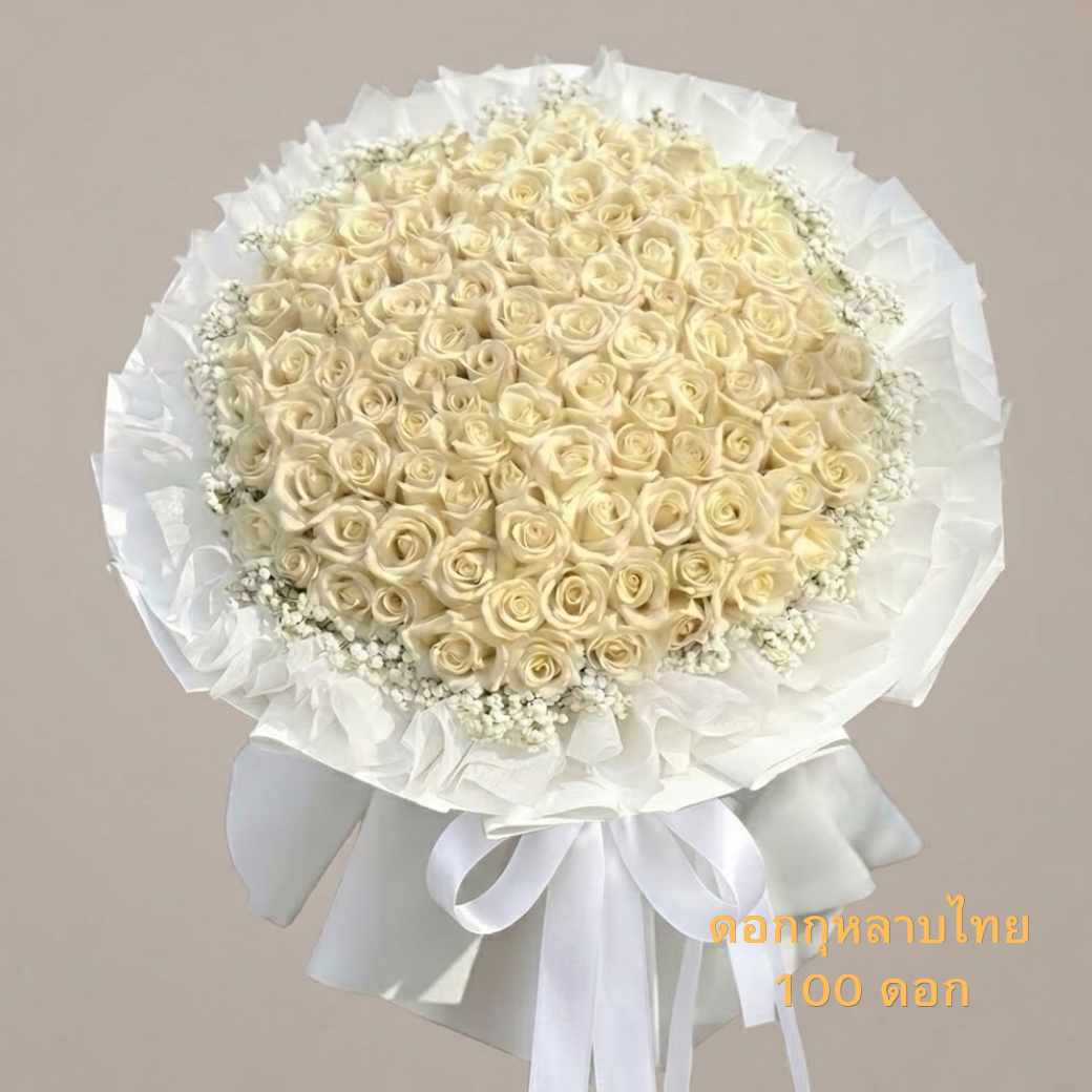 จำนวน 100 ดอกเป็นตัวแทนของความรักที่เต็มเปี่ยมและความจงรักภักดีนิรันดร์ การเลือกใช้ ช่อดอกกุหลาบขาว ขนาดใหญ่นี้จัดอยู่ในกลุ่ม ช่อดอกไม้โทนขาว ที่หรูหราที่สุด เหมาะสำหรับผู้ที่ต้องการประกาศความรักอย่างเป็นทางการและน่าจดจำไปตลอดกาล