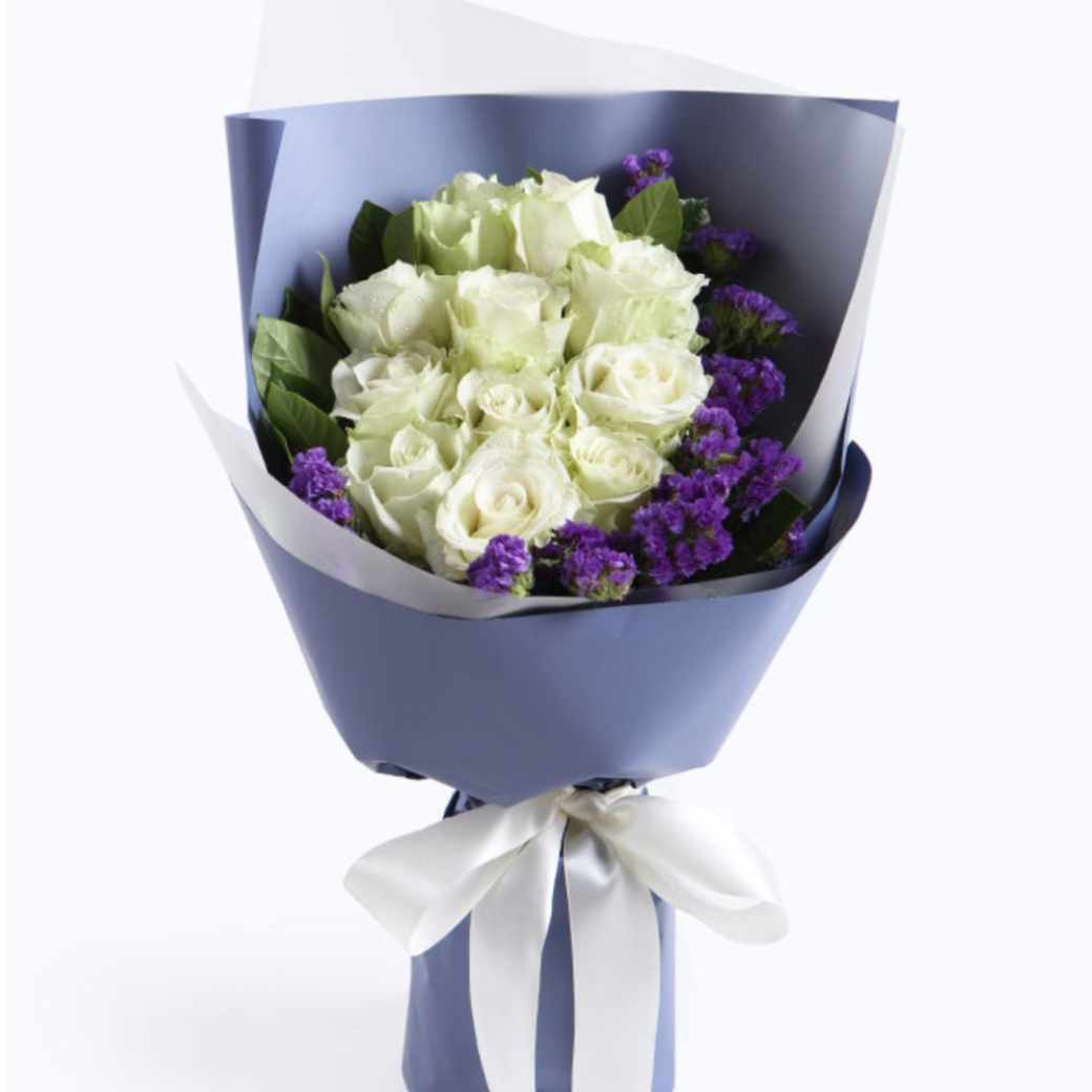 ช่อดอกไม้สด RW19 ช่อกุหลาบขาวคัดเกรด ตัดกับดอกสตีซสีม่วงเข้มดูมีเสน่ห์ ห่อด้วยกระดาษสีม่วงน้ำเงินใน โทนน้ำเงิน ม่วง ส่งดอกไม้ กทม ราคาถูก คุณภาพดีต้องรหัสนี้เลย