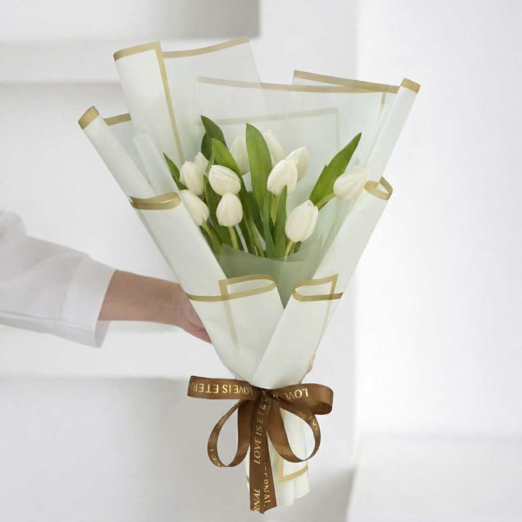ดอกทิวลิปสีขาวสื่อถึงความรักที่บริสุทธิ์ การให้อภัย และการเริ่มต้นใหม่ที่งดงาม โทนสีขาว-เขียวของช่อนี้ให้ความรู้สึกสงบและจริงใจ เป็นสไตล์ที่ได้รับความนิยมอย่างมากใน การจัดดอกไม้สไตล์มินิมอลและเกาหลี