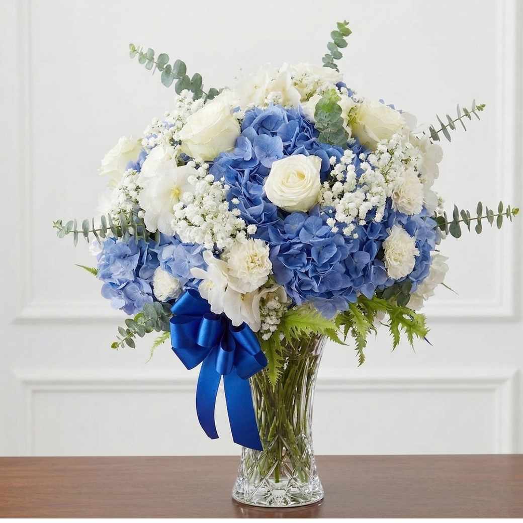 สัมผัสความอลังการของแจกันรหัส VASECLB01 ที่รวมดอกไฮเดรนเยียสีน้ำเงินเข้ม (Blue Hydrangea) และกุหลาบสีขาวบริสุทธิ์เข้าด้วยกัน จัดทรงพุ่มกลมมนดูนุ่มนวล ตกแต่งด้วยโบว์ผ้าซาตินสีน้ำเงินสด ช่วยสร้างบรรยากาศที่เย็นสบายตาและหรูหราในเวลาเดียวกัน